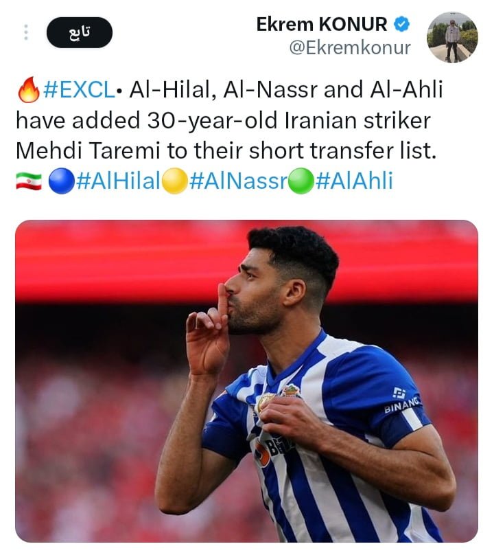 فكما ذكر الإعلامي التركي أكرم كونور عبر تغريدة على موقع التواصل الاجتماعي تويتر بأن ثلاثي أندية السعودية تضع مهدي طارمي ضمن أولوياتها خلال انتقالات صيف 2023.