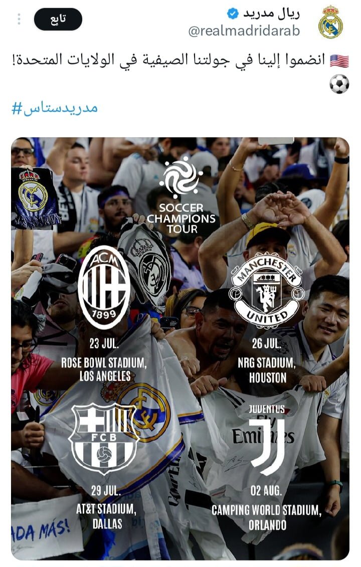 فقد أعلنت الصفحة الرسمية للنادي عبر تويتر عن مشاركة الريال كل من فرق برشلونة واي سي ميلان الإيطالي ويوفنتوس الإيطالي ومانشستر يونايتد الإنجليزي في وديات تجمعهم استعدادا لمنافسات الموسم المقبل 2023 2024.